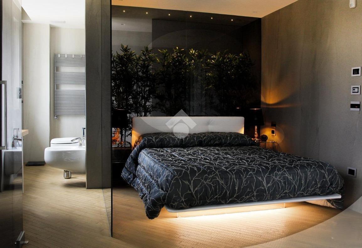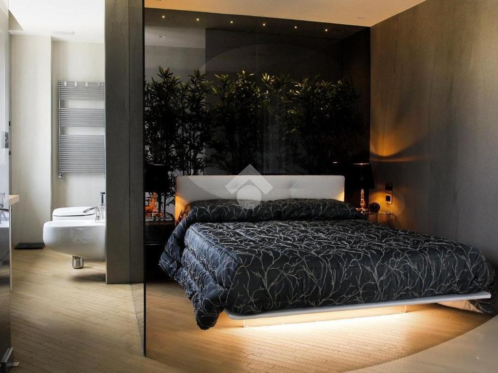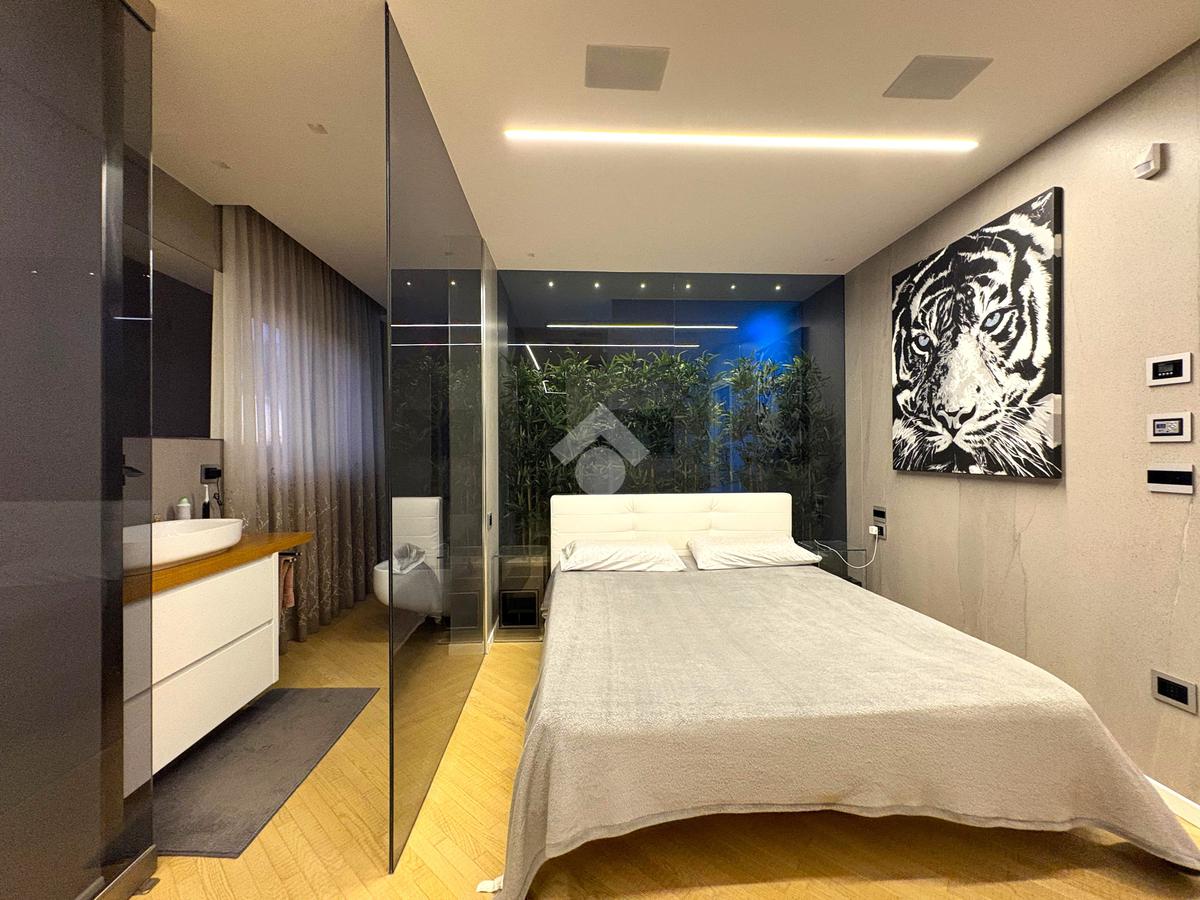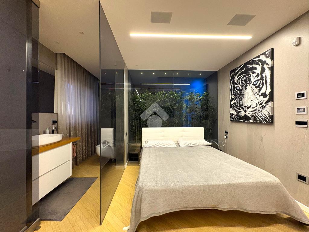 La zona notte è composta da una spaziosa camera da letto, arricchita da una cabina armadio di design e un bagno privato vetrato, situato dietro la testata del letto, per un tocco di esclusività e privacy.