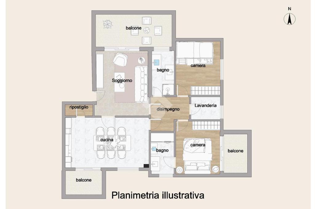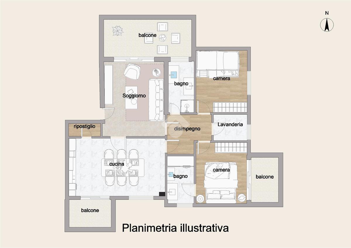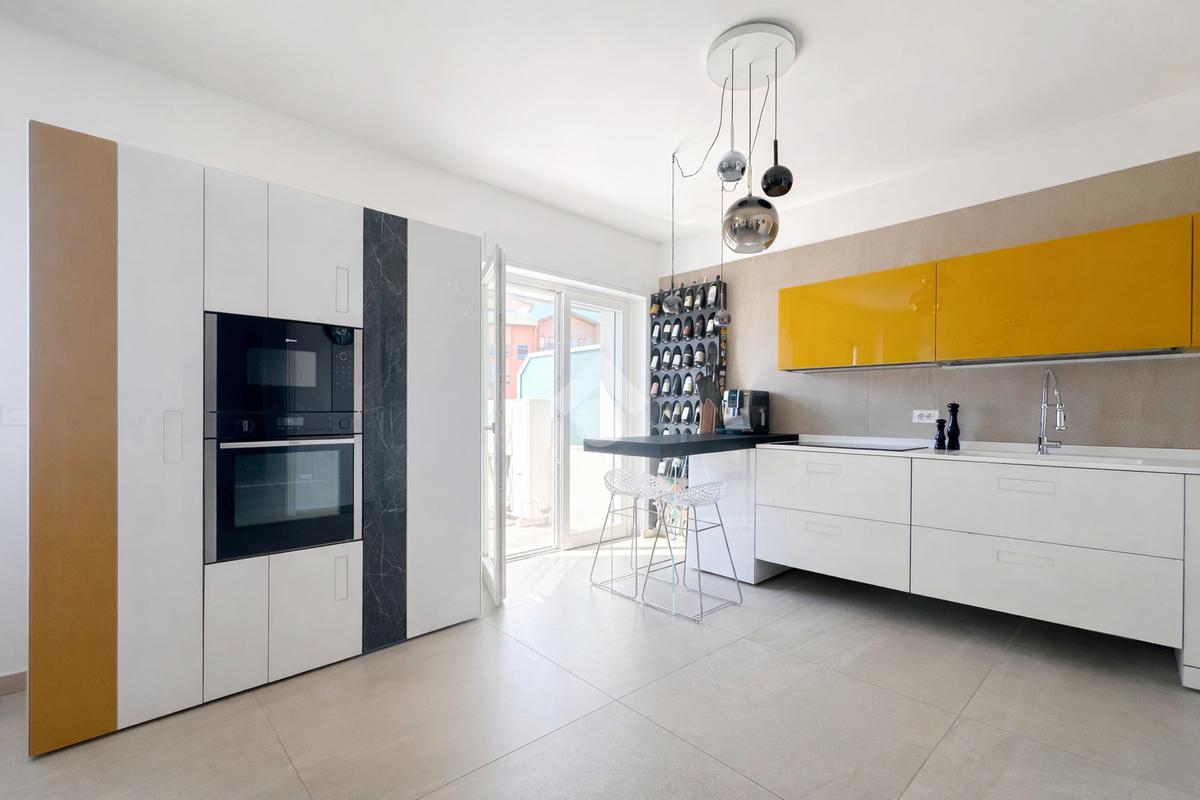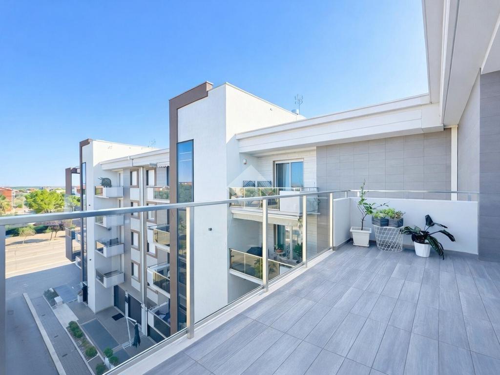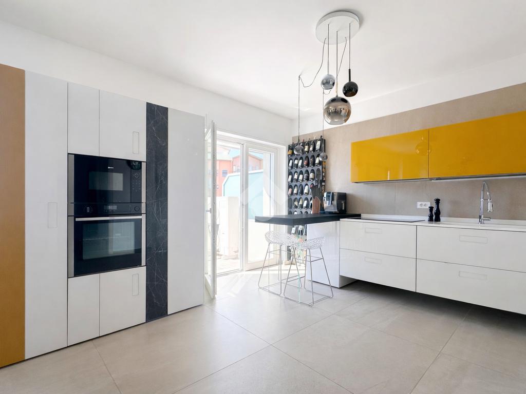 La zona giorno si apre su una luminosa area living composta da salotto, cucina abitabile con comoda dispensa e tre ampi balconi verandati.