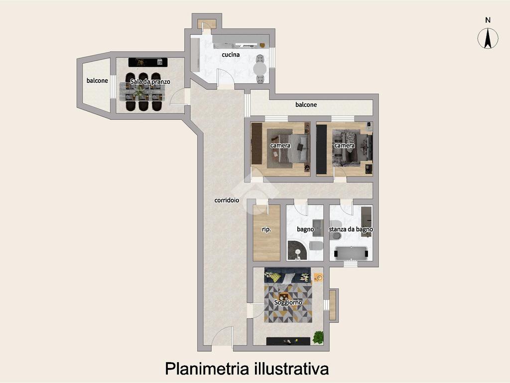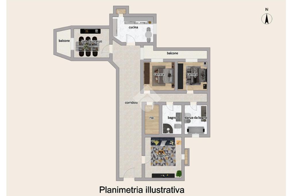 L’immobile è composto da ingresso con accesso ad una prima stanza attualmente adibita a salotto, con possibilità di creare una terza camera o uno studio; proseguendo verso il disimpegno troviamo due comodi bagni, di cui uno con box doccia e l'altro padronale con vasca. Completano la zona notte un ampio ripostiglio e due spaziose camere matrimoniali con accesso diretto al balcone.