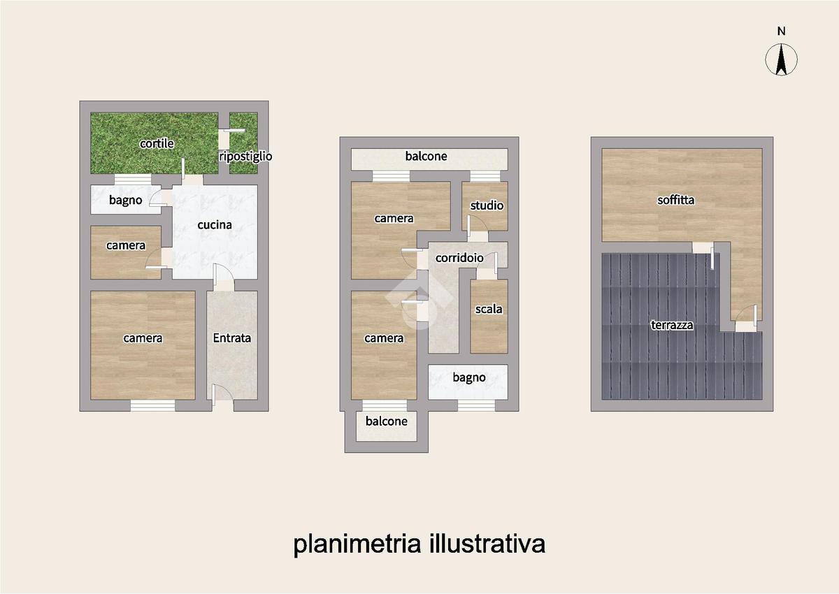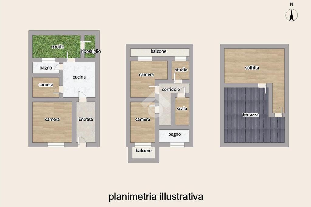 Attraverso la scala interna si accede al primo piano, dedicato alla zona notte composta da una camera da letto, una cameretta e una stanza aggiuntiva, ideale come studio o cabina armadio, oltre a un bagno completo.