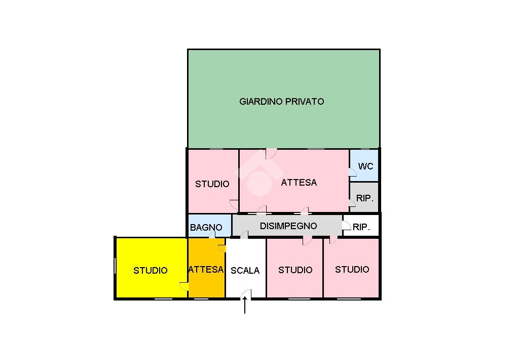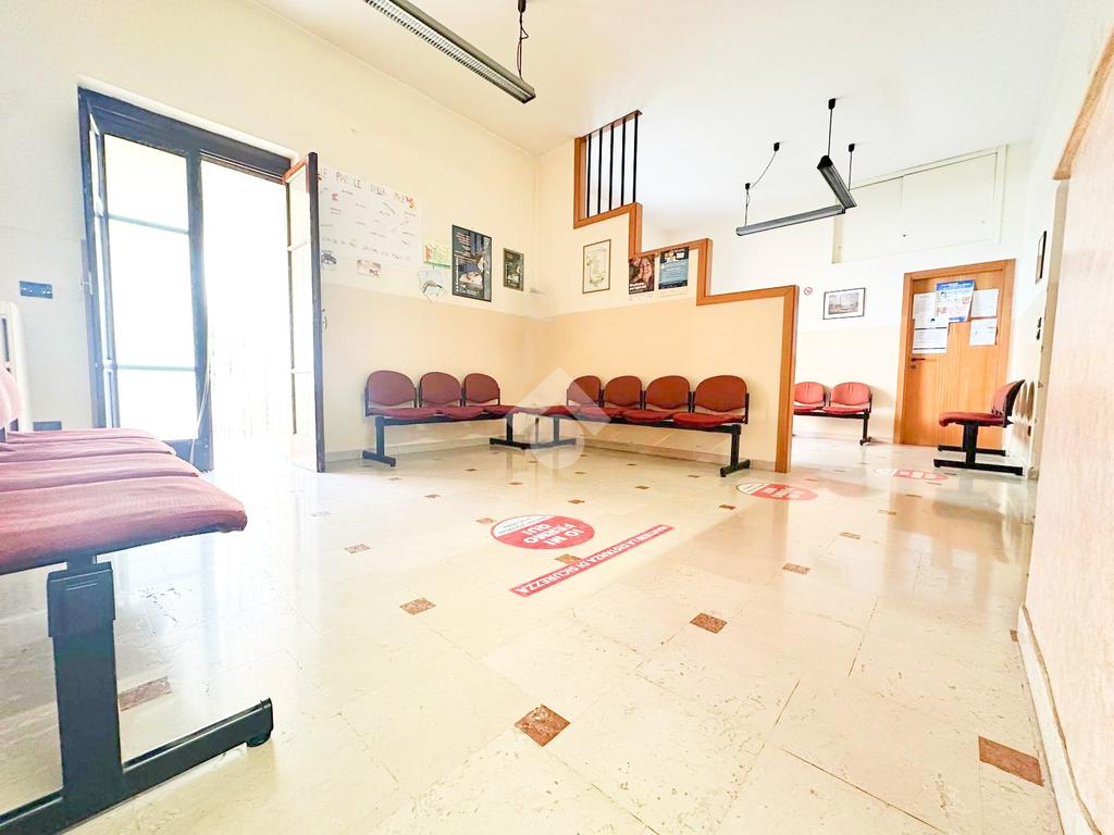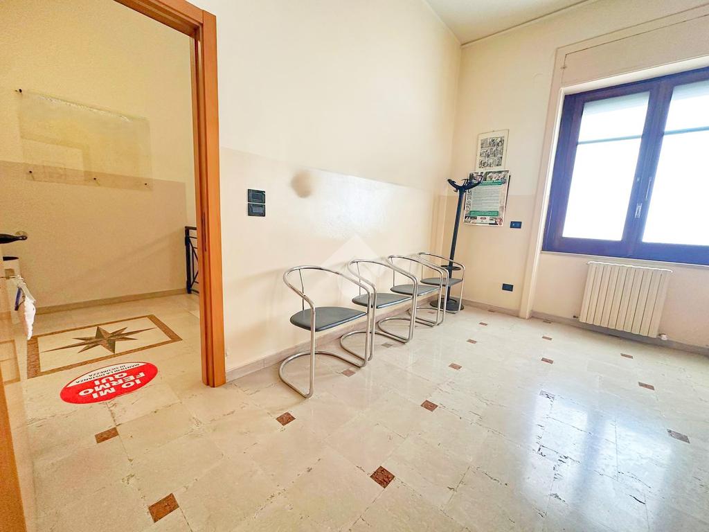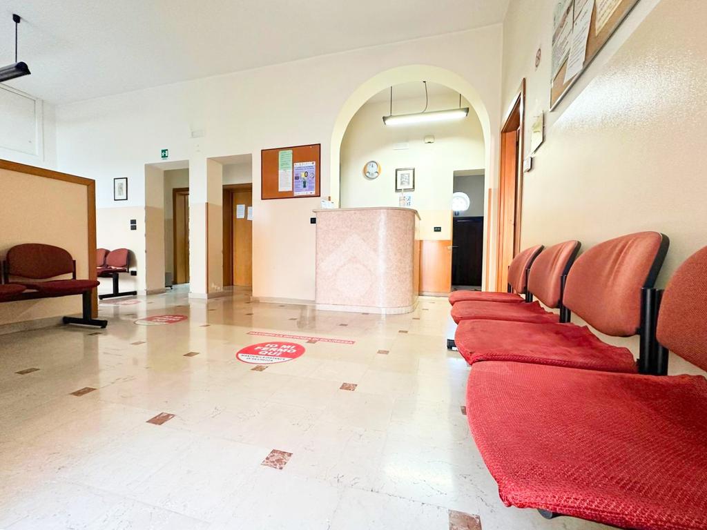 La doppia sala d'attesa, posta centralmente, suddivide in modo funzionale l'intero immobile in due zone interdipendenti, rendendolo ideale per studi associati o attività poliambulatoriali.